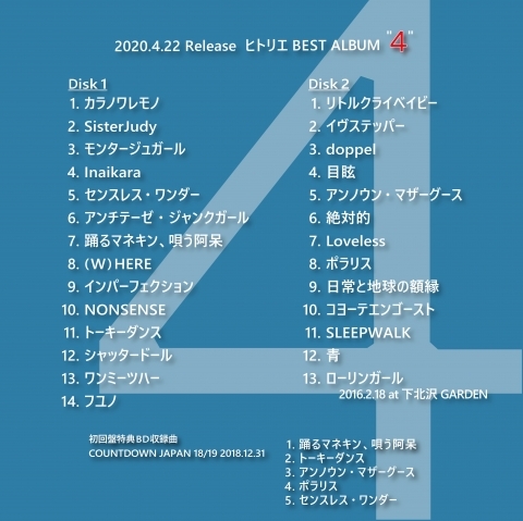 2020.02.07 ベストアルバム「4」ジャケット&収録内容公開 2020.4.22 リリース ベストアルバム「4」 ジャケット&収録内容公開 [初回盤] 2CD+BD(COUNTDOWN JAPAN 18/19 ライブ映像) [通常盤] 2CD 新しい記事 一覧ページに戻る 過去の記事