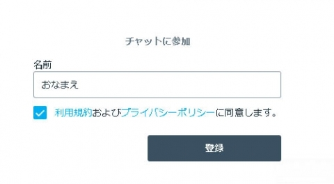 ※チャットに参加する場合は、名前、利用規約とプライバシーポリシーに同意のチェックを入れ、登録を押し、その後にメッセージを入力してください。(チャット上にお名前が表示されない場合は、メッセージ内にもお名前をいれてください ※任意)