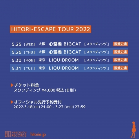 2022.03.18 『HITORI-ESCAPE TOUR 2022』チケット再販のお知らせ 『HITORI-ESCAPE TOUR 2022』チケット再販のお知らせ 東京・大阪振替公演 オフィシャル先行にてチケット再販スタート 5/25 BIGCAT 5/26 BIGCAT 5/30 リキッドルーム 5/31 リキッドルーム 開場18:15/開演19:00 3/18 21:00〜3/23 23:59 🎫 https://eplus.jp/hitorie/escape2022/ 新しい記事 一覧ページに戻る 過去の記事