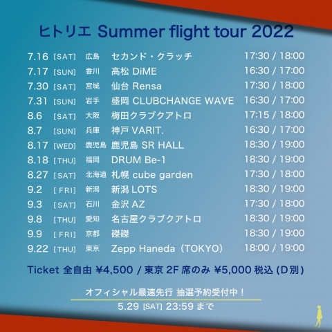 2022.05.13 TOUR 全国ツアー『ヒトリエ Summer flight tour 2022』 オフィシャル最速先行受付スタート 5/13 12:00〜5/29 23:59まで 🎫https://eplus.jp/hitorie/ 新しい記事 一覧ページに戻る 過去の記事