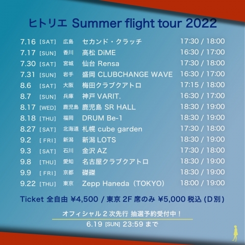 2022.06.08 TOUR 全国ツアー『ヒトリエ Summer flight tour 2022』 オフィシャル2次先行受付中❗️ 6/8 12:00〜6/19 23:59まで 🎫https://eplus.jp/hitorie/ 新しい記事 一覧ページに戻る 過去の記事