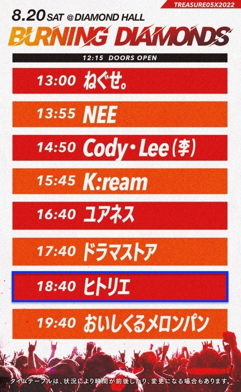 2022.08.06 LIVE 8月20日に名古屋ダイアモンドホールにて開催される『TREASURE05X 2022〜BURNING DIAMONDS~』タイムテーブル発表 ヒトリエは 18:40〜の出演となります。 イベントオフィシャルサイト 👉http://www.treasure05x.jp/ 新しい記事 一覧ページに戻る 過去の記事