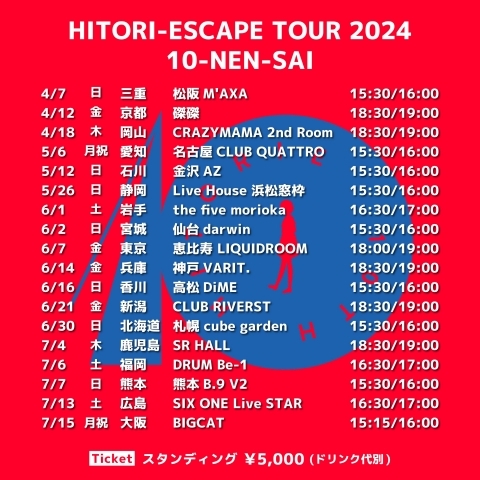 2024.05.19 TOUR 「HITORI-ESCAPE TOUR 2024 10-NEN-SAI」 (6月1日岩手公演〜6月30日札幌公演分) 本日AM10時よりチケット一般発売スタート! チケットご購入はこちらから 新しい記事 一覧ページに戻る 過去の記事